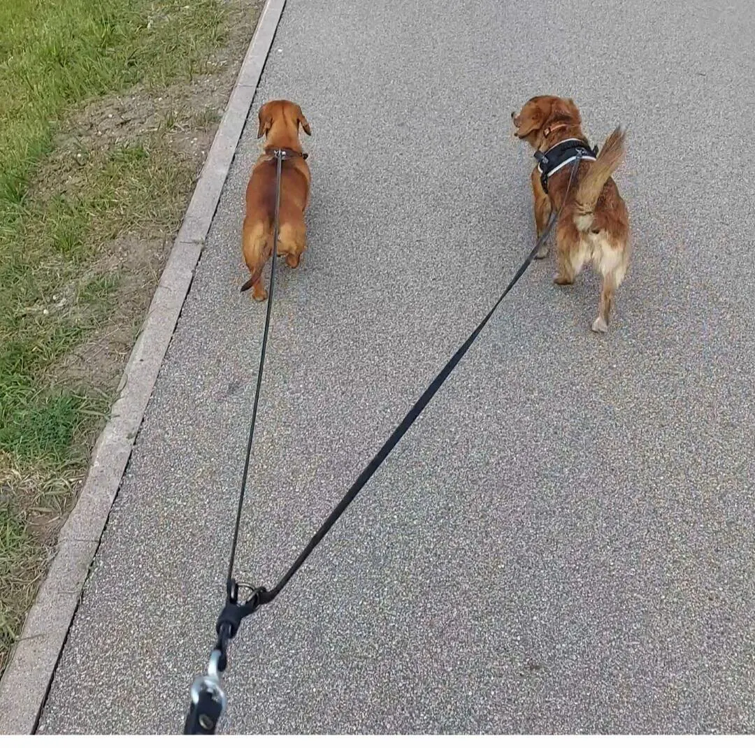 360° pöörlemine – lõpuks ometi pusadevaba: Keskses ühenduskohas on vastupidav ja vabalt pöörlev mehhanism. Sinu koerad võivad vahetada kohti ja joosta risti-rästi – rihm "sirgestab" end ise. Sa ei pea enam iga 10 meetri tagant peatuma, et sõlmi lahti harutada.